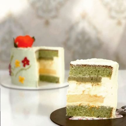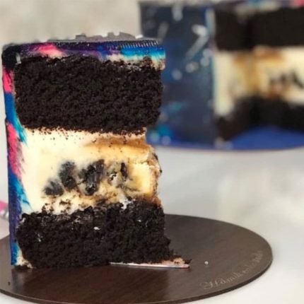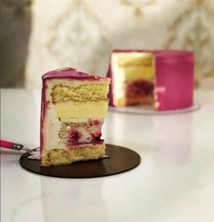 ترکیب اسفنج شکلاتی با فیلینگ موس انجیر و گاناش شکلات.