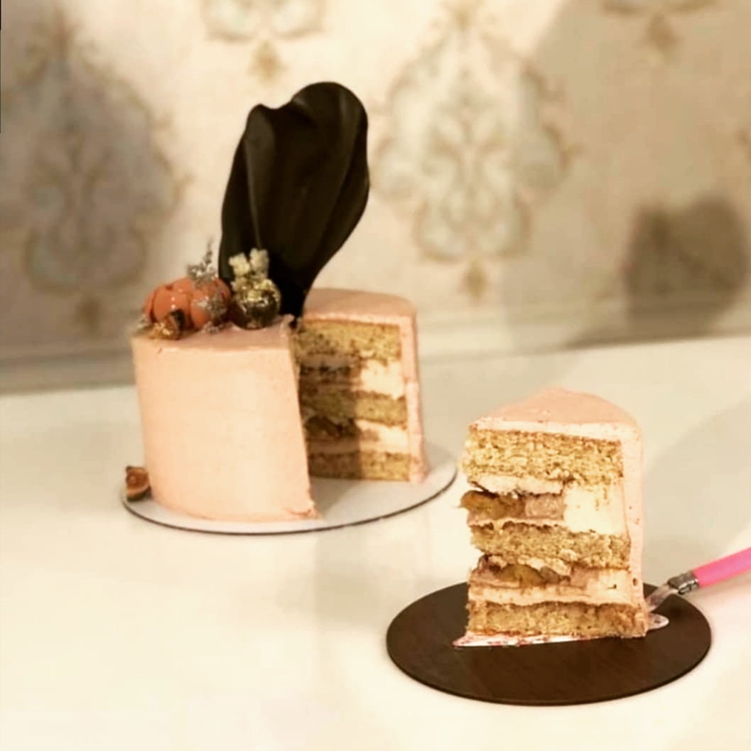 ترکیب اسفنج موز و دارچین با فیلینگ های گاناش موز، موز رسا شده و کرم موز.